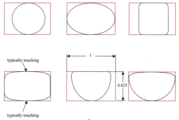 Examples of any cross-section shape fitting into a 1 to .625 ratio rectangular template, with the sectional shape touching both long sides of the template.